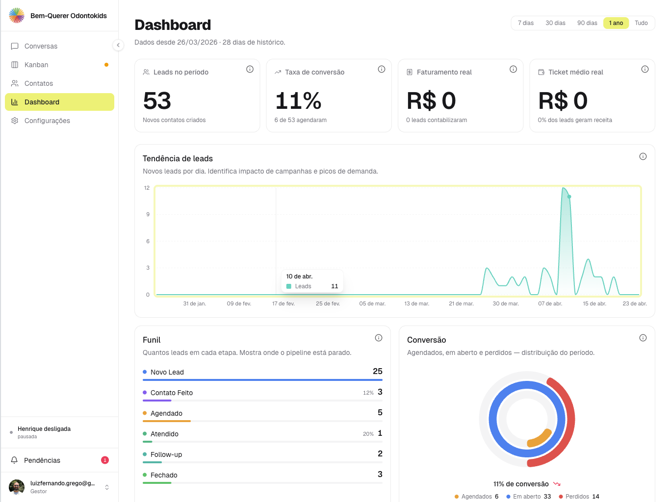 Pare de perder tempo com planilhas. Faturamento, conversão, origem e ticket médio num painel só — atualizados em tempo real enquanto a IA atende no WhatsApp.